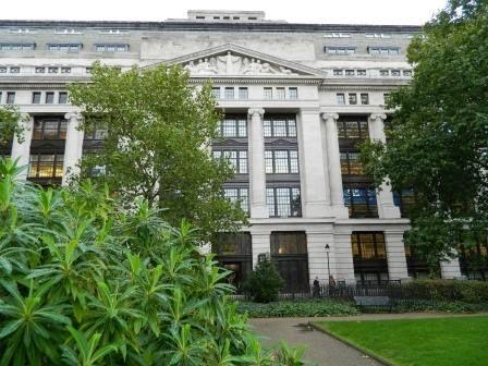 Here I'm standing at the centre of Bloomsbury Gardens facing towardsSouthampton House.Prior to the World War II the gardens were enclosed by iron railings and only open to residents. As part of the war effort the railings were melted down for the manufacture of ammunitions, and in the 1950's the gardens officially opened to the public. In the 1970's an underground car park was built beneath the square and a new landscape scheme created which further lost Repton's design.