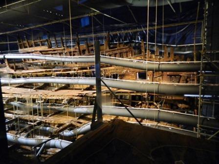 The Mary Rose - August 2013Author's own photoHaving walked through the first exhibition hall, the visitor enters a long viewing gallery overlooking the actual Mary Rose. The pipes are no longer spraying the wreck with polyethylence glycol, although it can still be difficult to make out details. However, on the opposite side of the walkway, the museum have recreated what the deck would have looked like - including placing actual artefacts in the scene.
