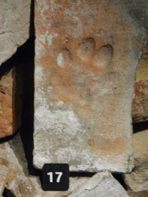 Paw print on a tile found in the galley.Author's own photo.Sticking with the dog theme, another item that caught my imagination was this clay tile. It was found in the galley area, one of hundreds of tiles packed around the large cooking cauldron to protect the ship's timbers from the fire beneath. How extraordinary is it, to think nearly half a millennia ago a dog ran across wet clay, and that tile found it's way onto the Mary Rose and then lay under the sea for hundreds of years...
