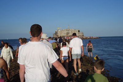My husband in the foreground on a 'walk to the fort' - traversing a gravel path that becomes visible only at extreme low tide.