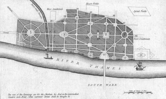 John Evelyn's plan for rebuilding London on a structured grid pattern.This never happened as Londoner's swiftly started rebuilding on the site of their ruined homes.