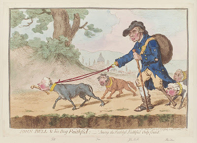 John Bull and his dog, Faithful.A play on the politicians of the day.The theme of dogs as faithful is frequently repeated such as in this quote from Sir Walter Scott in 1825:"Recollect that the Almighty, who gave the dog to be companion of our pleasures and our toils, hath invested him with a nature nobleand incapable of deceit."