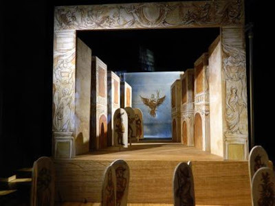 The screen before which the actors performInigo Jones used tricks of perspective, (a recent ‘invention’), as well as layering, lighting and masking to transform a 2-D stage into a 3-D drama. The clever people at the Banqueting House give the visitor a feel for these effects with Monty Pythonesque slides of scenery projected on the stage backdrop as the performance takes place.