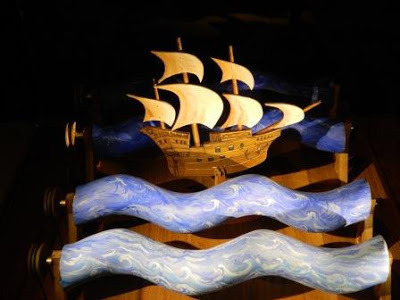 A model of Inigo Jones's contraption for lowering the queenout of a cloudThe aspect that most fired my imagination were Inigo Jones set designs and his use of early special effects. But first, a little background about ‘Performing for the King’ the creation of a court masque. The aim of the Banqueting House’s curator, Jane Spooner, is to give the visitor a sense of what went on behind the scenes at a 17th century masque and a taste of the atmosphere.