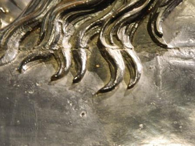 A detail showing the joins and a pin used to assemble the sculptures.Over the centuries each horse has been repainted multiple times. If you look carefully you can see a small area on some of the horses (on their flank, about halfway down) made up of postage-stamp sized areas of differing colours. This is were conservationists have painstakingly removed layer upon layer of paint to reveal the previous liveries.