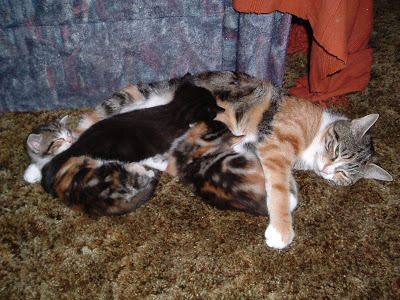 Noni, (one of my cats) and her kittens.Sun and MoonAnother story, recounted in 1664 by Pierre Palliot, writes of the involvement of the planets in the making of cats. At the moment the world came into existence, the Sun and the Moon competed with each other to create animals. The Sun gave birth to the lion – showy, magnificent and fiery. When the moon saw the admiration of the other planets for the lion, she caused the cat to come forth – cool, elusive and mysterious. However, the Sun, jealous of the Moon’s achievement, belittled the Moon who tried to out-do herself by creating the Monkey. This was met with howls of derision from the stars. In a fit of pique, the Moon avenged herself by swearing an undying enmity between the Cat and the Mouse.
