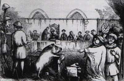 A pig in the dock, on trial.Case Number Three: The Blasphemous PigIn 1394 a sow stood accused of blasphemy. The unfortunate creature had strayed into a church, where she had eaten a communion wafer left out on the altar. Such disrespect could not be tolerated, but when it came to deciding a punishment the priests had a theological problem. When the sow ate the sacred wafer had her flesh transubstantiated into that of Christ's? Eventually, the pig was executed, by which time there was no trace of wafer in her gut - much to everyone's relief.