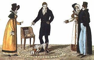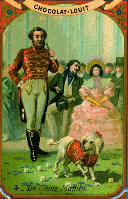 Munito- featured in an advert for chocolate! For a family night out in the 19th century, a trip to see Munito, the Wonderful Dog, was de rigour. Indeed, Munito was such a celebrity that he listed the Prince Regent and Duke of Yorkamongst his fans. This intelligent dog could perform tricks, do sums and spell using lettered cards, and he started his career in Paris, playing dominoes - which fascinated the Parisians who bet bonbons and cakes on the outcome of his games.His master was Signor Castelli, of whom little is known other he came from Italy and was thought to be in his 50's. Castelli spoke no English, only Italian and bad French, which he claimed the dog understood. The pair were often seen walking in London, with Castelli chatting away to the dog as if holding a conversation. But the dog, Munito, was not only intelligent but also brave. Apparently, he helped his master, Signor Castelli, rescue a woman from drowning and as a result was awarded an honoury medal by the Royal Humane Society.