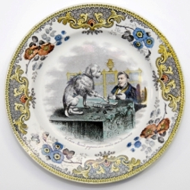 A plate showing Munito playing dominoes.How was Munito trained?The answer to how Munito was trained, was answered by, of all people, the novelist Charles Dickens. In 1867 Dickens wrote about having seen Munito's act, some 45 years earlier."… a learned dog was exhibited in Piccadilly - Munito … He performed many curious feats, answering questions, telling the hour of the day … picking out any cards called for from a pack on the ground.”Dickens set his observational skills to work and noticed how Munito walked around the cards sniffing them. The writer came up with an explanation as to how Munito did the trick.“We watched more narrowly … noticed that between each feat the master gave the dog some small bits … of food, and that there was a faint smell of aniseed from that corner of the room.”