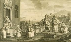 Children hoping to be admitted Foundling Hospital.On admittance the children were given a different name - the new one carefully recorded against the old, in case a parent later returned. The very first admitted were named after Thomas Coram and his wife, Eunice. Initially, the governors leant their names to children but this proved a mistake when those same children came of age and had mistaken hopes of high parentage. Safer, more none committal names became the vogue, such as Robin Hood, or Elizabeth Foundling.