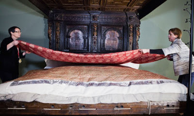 Photo courtesy of the Guardian newspaper.Billed as able to sleep 12, the fame of the Great Bed of Ware spread so much that travellers often chose the town of Ware to break their journey simply to spend one night in the bed. People who slept there marked the occasion by carving their initials on the bed or adding their red wax seals, which are still visible on the bedposts and headboard today. Apparently 26 butchers and their wives spent the night in it for a bet in 1689, (52 people!) but it was also popular with the rich and famous - in 1596 Prince Ludwig of Anhalf-Kohten visited Ware and slept there, and in 1610 Prince Ludwig Friedrich of Württemburg stayed in it.