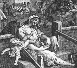 Sadly, this scene is not as outlandish as it might appear. Records exist of a woman, Judith Dufour, who reclaimed her child from the workhouse and then strangled it, in order to sell the child's clothes (for 1s. 4d.) in order to buy more gin.