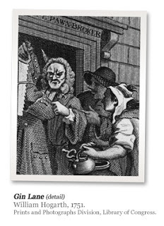 In Hogarth's painting, languishing in front of the disreputable mother is a skeletal pamphlet-seller. He rests with his eyes closed, glass in hand (from which he drank gin?) whilst a leaflet titled "The Downfall of Mrs Gin," moralising about the evils of alcohol, spills from his basket.