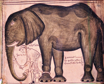 One of the first naturalistic pictures of an elephant - By Matthew Paris of Henry III's elephant and his keeper. Keeping Out the Cold