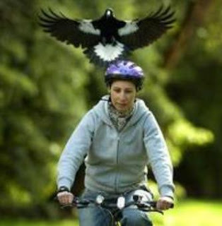 An Australian magpie pursuing a cyclist.It seems the magpie is beleaguered so because, according to Christian folklore, the magpie was the only bird to remain silent and not sing to comfort Jesus at his crucifixion. Perhaps even more sinister is Scottish ore that holds a magpie keeps a drop of the devil's blood beneath his tongue!So if you meet that most portentous of sights, a lone magpie, how can you diffuse it's evil influence? Simple! You talk to him, saying: