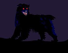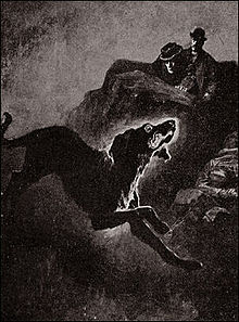 Illustration from Conan Doyle's "Hound of the Baskervilles."Many legends have a 'shuck' dog haunting the gallows as if waiting for a soul to steal. For instance, in 1751 in Tring, Hertfordshire, an old woman was drowned by a chimney sweep because he suspected her to be a witch. He was then found guilty of her murder and sentenced to death by hanging, where upon the gibbet became haunted by a large black dog. The local schoolmaster saw and described it-‘Eyes of flaming fire, shaggy… and as big a Newfoundland.’