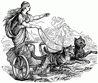 A Norse legend, tells that Freya, the goddess of love and fertility, rode in a chariot pulled by two black cats although the latter were actually horses that had been possessed by the devil. The cats served Freya well for seven years, and at the end of this time were rewarded by being turned into witches – disguised as cats.