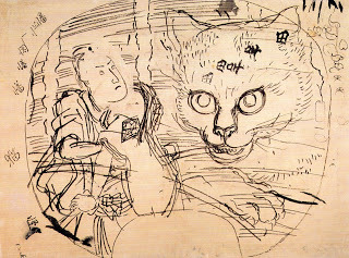 A Japanese ghost cat.The victim could avoid this fate by eating the cat that he had killed. Indeed, it wasn’t too late even if symptoms started to develop, since killing another feline and that one instead could affect a cure!Consider then the Irish, three hundred years ago, who believed that to kill a cat brought seventeen years bad luck. A man who drowned a cat would himself die by drowning, and a farmer could expect all his cattle to die. Although a broth of boiled cat was said to cure tuberculosis, people were so afraid of the consequences, that they hired professional ‘hit men’ to kill the cat for them and hence take the bad luck.The last word goes to the Cat-Goblins of Provence. These are spirits that after sunset appear as cats with glowing eyes, who like nothing better than to cause mischief to humans. The traveller is advised to cover his own eyes against them, seek the help of the saints and make for a lighted building – an excellent excuse to find the nearest hostelry in which to recover!