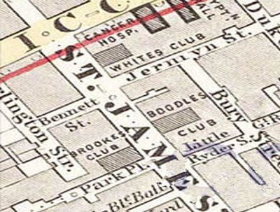 Whites' club on the left. In Sophy's day, as she turned off Piccadilly the first gentlemen's club she would pass was White's at number 37. Further down, Boodles at number 28, and on the opposite side of the road, 60 St James's Street, Brooks'.