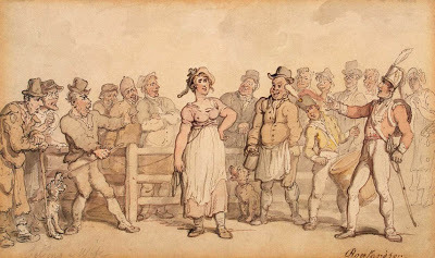 Contempary drawing by Thomas Rowlandson. However some husbands were a little too honest when selling their wives, as with farmer Joseph Thomson and his spouse of 3 years. He offered her for auction in Carlisle, listing her bad points as ‘Born serpent’ and ‘his tormentor.’
