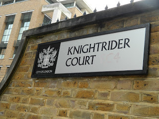 Here I'm standing in Knightrider Court with my back to the Thames, facing towards St Pauls Cathedral. Within sight of St Pauls Cathedral is Knightrider Court, and the story goes that as a mark of respect knights were expected to dismount here to proceed on foot past the holy building. Again, the truth behind this myth is lost to us.