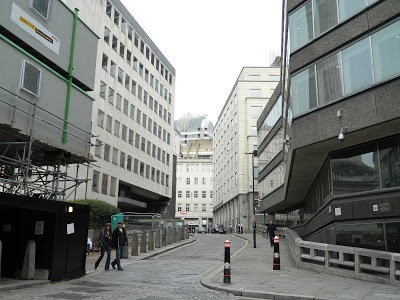 Here, ladies and gentlemen, is modern day Pudding Lane -note the portakabins to the left and street sign on the right.