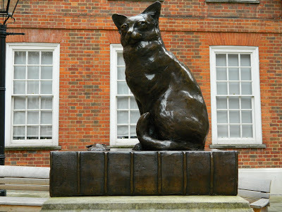 Hodge's memorial - Gough Square.When Dr Johnson wrote that cats were 'commonly reckoned' the lowest feline species, it is my opinion he was being ironic - for the great man was a huge fan of cats. During his life he owned (or 'was owned by'!) several cats, of whom the most well-known was Hodge. In fact, so well-known was Johnson's affection for Hodge that a statue of the cat, appropriately seated on a dictionary, is to be found at the far end of Gough Square.