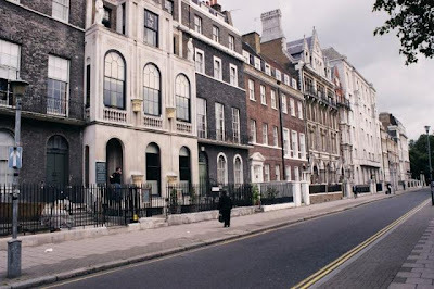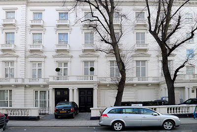 Leinster Gardens - the fake facade is behind the silver car -note the blocked out ground floor windows.The solution was to demolish the houses to allow excavation of the tunnel, then rebuild the facades to conceal the hole behind, which as left open, to allow the train drivers to vent their engines steam - much to the alarm of horses passing by on the road.