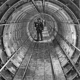 I went down and down between two dingy walls until I found myself at the round opening of the gigantic iron tube, which seems to undulate like a great intestine in the enormous belly of the river.Contemporary account by Edmondo De Amicis.
