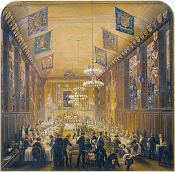 Clothworkers Hall - Dinner 1856Many guilds had their headquarters in large houses or halls, often bequeathed by wealthy members. The halls were lavishly decorated, but sadly most were destroyed in the Fire of London, 1666. Indeed, the Guildhall built around 1411, was the only secular stone building to survive the great fire. So what has this to do with "At 6's and 7's"?