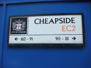 Modern Cheapside (Saturday 22 September 2012)Because Cheapsidewas regularly thronged with people, it was also prime site for a pillory - or place to publicly humiliate those who had broken the law. The offender was fastened into the pillory by their neck and wrists, on a platform so everyone had a good view. [Stocks were subtly different, the villain being fastened only by their ankles.] The crowd then pelted the wrong-doer with anything that came to hand, from rotten eggs and vegetables, to blood and guts from the nearby slaughterhouses. Concerns about public disorder meant the pillory was abolished as a punishment in 1837.