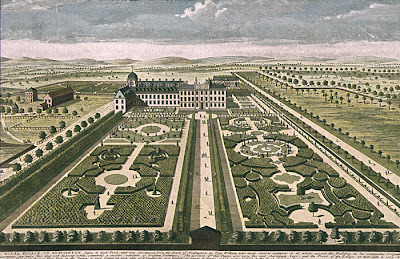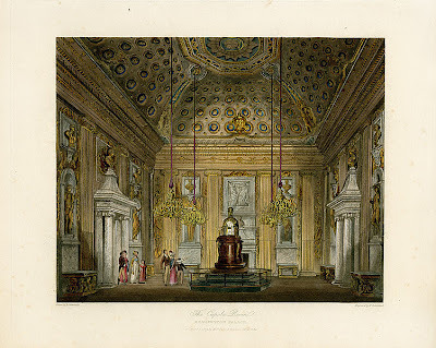 Kensington Palace and grounds - in its 18th century heyday.The surprising thing about Kensington Palace is its sense of intimacy. In last week's post I mentioned the Grand Staircase which is awe-inspiring but because of the cheeky, boldness of the Georgian mural, rather than its scale. At the top of the stairs, you turn right to enter the King's Presence Chamber - similar in size to a modern sitting room - rather than some huge, palatial chamber. However, this is where the comparison ends because the decoration is gorgeous and gaudy, leaving the visitor in no doubt they are in entering into a royal presence.
