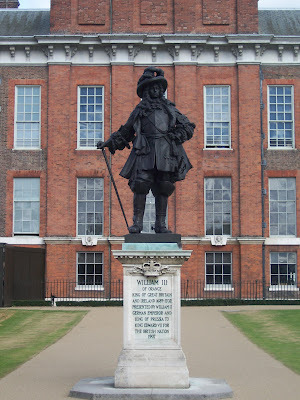 The statue of William III outside Kensington Palace. George I filled the gallery with fabulous paintings, of which the most famous are Tintoretto's "The Muses" and "Ester before Ahasuerus" and Van Dyck's portrait of Charles I. When King George inspected the room shortly after its completion he was said to be 'well pleased.'