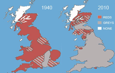 Distribution of red vs grey squirrels in the past 70 years.Courtesy of British Red Squirrel Society.As an aside, if you are tempted to think grey squirrels are 'cute' - it is an offense punishable by 2 years in prison, to nurse and re-release an injured grey into the wild in the UK. If you find a grey squirrel in distress, then by law you are required to take it to a veterinarian for humane destruction. This may seem harsh, but in 2001 the grey population was estimated at 2.5 million and the red squirrel is only hanging on in certain protected areas, including the Lake District and the Isle of Wight.