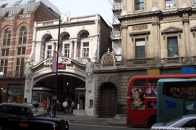 The Burlington Arcade to the left and the edge of the Royal Academy to the right.Originally a single storey building, an upper level was added in 1906 with apartments to let (as one wit put it, "To a better sort of courtesan".) The original triple arch entrance was removed in 1931 and a new design added, which was much disliked at the time. The shops are small but famous for selling expensive, luxury goods - hence quality over quantity.