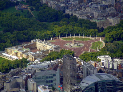Buckingham Palace from the air- photo Thomas Nugent.The actual spot is marked by a brass plaque in what was medieval Charing Cross (more of this later), near the currentTrafalgar Square and the equestrian statue of King Charles I.
