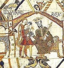 Edward the Confessor, depicted in the Bayeux tapestry.However merchants in the old city of Londonconsidered it an unreasonable distance to travel to Westminsterand the new seat of authority, and so when traders wanted to hear the latest government policy they met at a half way point - Charing Cross. It is this spot, marked by the brass plaque and is still the official centre of London, so much so that people working within a 6 mile radius can claim London-weighting for their expenses and are entitled to extra payments.