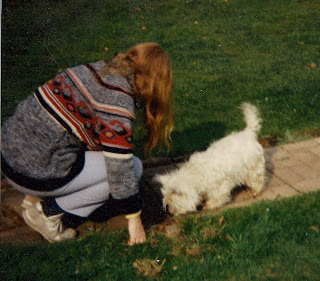 The author, Carola, with Candy.Before I started to write mysteries, I wrote a large number of Regencies. Needless to say, dogs were important in many of them. There was Osa, in Angel, who saved her master from drowning; Curly, in The Improper Governess, who not only had curly fur but kept a little boy warm by curling up with him for the night when he ran away from home; Ragamuffin, in the Tudor Signet; and in A Lord for Miss Larkin, large black Midnight and small snow-white Flake, Goose, and Drop.