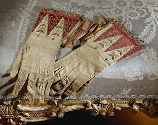 Click for link.Queen Elizabeth I's gloves.Eighteenth-century Irish "chickenskin" gloves were even thinner and smoother than kid. They were cut from the skins of aborted calves, and so fine that they came folded into the shell of a walnut. Margaret Visser – The Way We Are.(Not sure I like that idea, it sounds very grim! )As with a handshake, gloves meant faith in the transaction or confidence in the person, so transactions of land or property could be made by handing over the symbol of a glove.The tradition of “throwing down the gauntlet”, has survived in language at least, where a knight might challenge another to a duel by casting a glove at his feet – the glove being a symbol of hand to hand combat. And Judges often used to wear gloves as a symbol that their hands were unsullied by the criminals they had jurisdiction over. Gloves "lined" with money were famous as formal bribes and judges and other high up members of society often received far too many pairs of gloves to use them all; for this reason, many fine specimens survive. These are often highly decorative, with gold braid, embroidery and sumptuous beading, as in this example. The poorer gloves, such as the ones Ella is given, that would be worn for warmth, rarely survive.