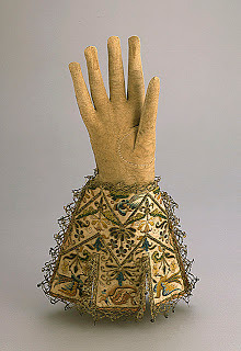 Early 17th century glove (Courtesy of V&A)In the 16th and 17thcenturies so much etiquette developed around them that men’s gloves in particular grew wider and more decorative as they were so often carried rather than worn. It was taboo to offer to shake a hand wearing gloves, or to accept a gift in a glove. Nor was it acceptable to remove them with the teeth. Approaching an altar in Church, men had to remove their gloves, and the right glove had to be removed when coming into the presence of a social superior as a mark of respect. The keeping on of your gloves indicated that you retained power by declining physical contact, whereas the removal meant you deferred to a higher position. Gloves were also to be put off when playing cards (to deter cheating, I suppose) or when eating. From the symbolic use of gloves the custom grew up of presenting them to people of distinction on special occasions. When Queen Elizabeth visited Cambridge in 1578 the vice chancellor offered her a