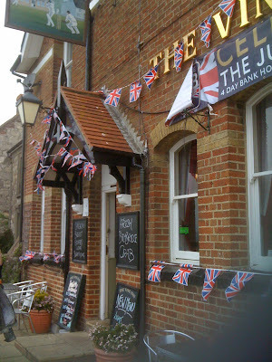 The local pub (overlooking the Village green) decked out with bunting.Next week: Smuggling - Women Smugglers. 'Hope's Betrayal' - the story: One wild, winter's night two worlds collide. Known for his ruthless efficiency, Captain George Huntley is sent to stamp out smuggling on the south coast of England. On a night raid, the Captain captures a smuggler, but finds his troubles are just beginning when the lad turns out to be a lass, Hope Tyler. With Hope as bait, the Captain sets a trap to catch the rest of the gang. But in a battle of wills, with his reputation at stake, George Huntley starts to respect feisty, independent Hope. Challenged by her sea-green eyes and stubborn loyalty Huntley now faces a new threat - his growing attraction to a sworn enemy. But a love where either Hope betrays her own kind, or Captain Huntley is court-marshaled, is not an easy destiny to follow.