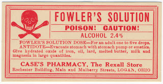 In the 1840's, arsenic was discovered in the spa waters at Bath, which in the mind set of the day, offered a possible explanation for the beneficial effect of spa therapy. And finally, you may be relieved that not all doctors were convinced that the benefits of arsenic outweighed the risk of poisoning. "A large section of the profession repudiate arsenic altogether…hurling invectives against the temerity and recklessness of the doctors who prescribe it." All this, set against those physicians who insisted that Fowler's solution was invaluable and would, "Sacrifice nine-tenths of the Materia Medicia for arsenic."