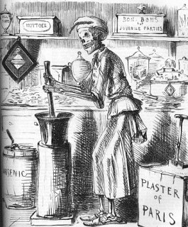 Punch parody of sweet making in Victorian Britain.One Monday in October, 1858, Mr Neal sent his assistant to buy a quantity of plaster of Paris from the druggist. The reason? It was much cheaper than sugar and could be used as 'daft' or an inexpensive substitute to bulk up sweets. The assistant called on the chemist, who sent his apprentice to the cellar, where he weighed out twelve pounds of daft. Unfortunately, the new assistant measured out and mistakenly sold him the wrong white powder - arsenic. This deadly poison was taken back to the sweet shop where it was incorporated into peppermint drops - which killed twelve people and made over a hundred seriously ill.