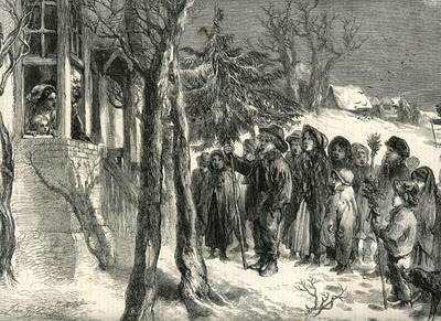 The Gentleman's Magazine of 1824 records some Christmas Eve celebrations in Yorkshire."At eight o'clock in the evening, the bells greet 'old Father Christmas' with a merry peal. The children parade the streets wth drums, trumpets, bells or…even a poker and a shovel, taken from the humble cottage fire." Christmas Eve was also said to be a good night for an unmarried woman to divine the identity of her future husband. Apparently this good time to meddle in the dark arts because ghosts and other spirits were said to be powerless on this night. The method of doing this was recorded by Sidney Addy in 1890."If a girl walk backwards to a pear tree, on Christmas Eve and walk around the tree three times, she will see an image of her future husband."And finally, at the midnight hour church bells would ring and many people would open their doors to welcome Christmas in. It was said that on the stroke of midnight cattle would kneel down in their stalls and bees hum the Old Hundreth Psalm in their hives.