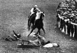 The fateful moment Emily brings down the king's horse.The Suffragette's claimed Emily as the first martyr to their cause and later Emmeline Pankhurst wrote that Emily had decided only the loss of life would:"...put an end to the intolerable torture of women."