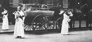 Emily's coffin escorted by Suffragettes.In reality Emily Davison's death so horrified the politicians that they argued if an educated woman such as Emily, could act to irrationally, what bedlam would British society be plunged into if less educated women were allowed the vote?