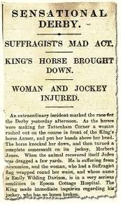 Emily Davison - circa 1913To get publicity for the cause of women's suffrage, Emily ran onto the race track during the 1913 Epsom Derby, and threw herself at the king's horse, Anmer. Tragically, she was trampled and died of her injuries.