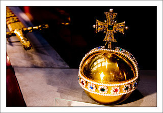 The Sovereign's Orb - hidden by Blood's conspirator in his trousers! The thieves had thought of every detail; Blood carried a mallet to hammer the St Edward's crown flat and then conceal it under his clothes, another conspirator hid the Sovereign's Orb down his trousers and the other cut the Sceptre with the Cross in half. However it was at this moment that Edwards' son returned to visit and seeing the crime in progress, tried to apprehend the villains. The cry was raised,"Treason! Murder! The crown is stolen!"