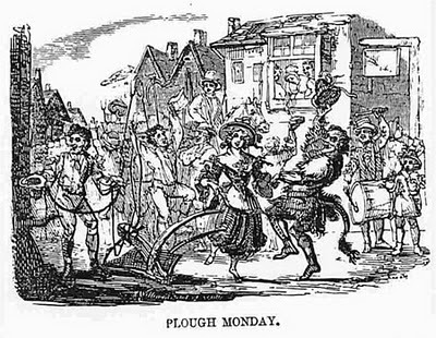 A plough being taken through the streets to raise money.Plough Monday. Plough Monday was the first Monday after Twelfth night and widely regarded as the start of the agricultural year. In 15th century England there are references to Plough Lights being lit in churches, these candles were kept burning to bring God's blessing on the farmers' efforts. But then things become a bit blurry, because some parishes formed 'plough guilds' to raise money to pay for the candles, and then raising money became an end in itself with ploughs being taken round from church to church for fund-raising purposes. With the Reformation plough lights were banned as superstitious and the practice died out.