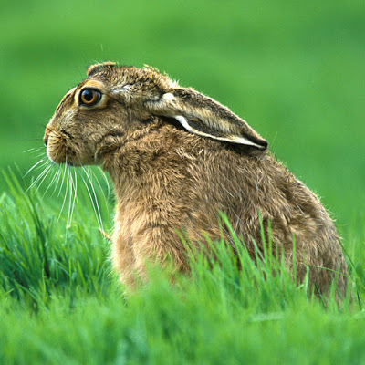 The brown hare is generally larger than a rabbit. They have long, black-tipped ears and a tall and leggy appearance. They are timid and fast runners. They prefer grassland fields and some woodland in their habitat. In the Peak District of England, you will find the smaller mountain hare.